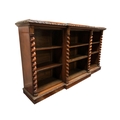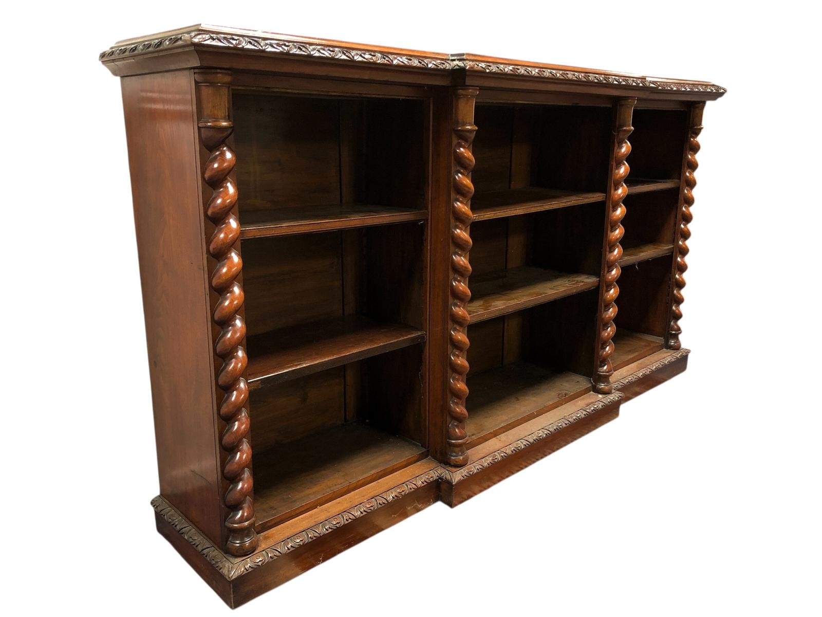A 19TH CENTURY CARVED MAHOGANY OPEN FRONT BOOKCASE of breakfront outline the shaped top above nine open shelves, six adjustable, between spiral twist pilasters on platform support 111cm (h) x 206cm (w) x 43cm (d)