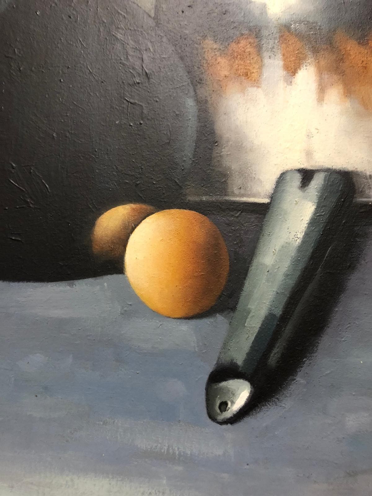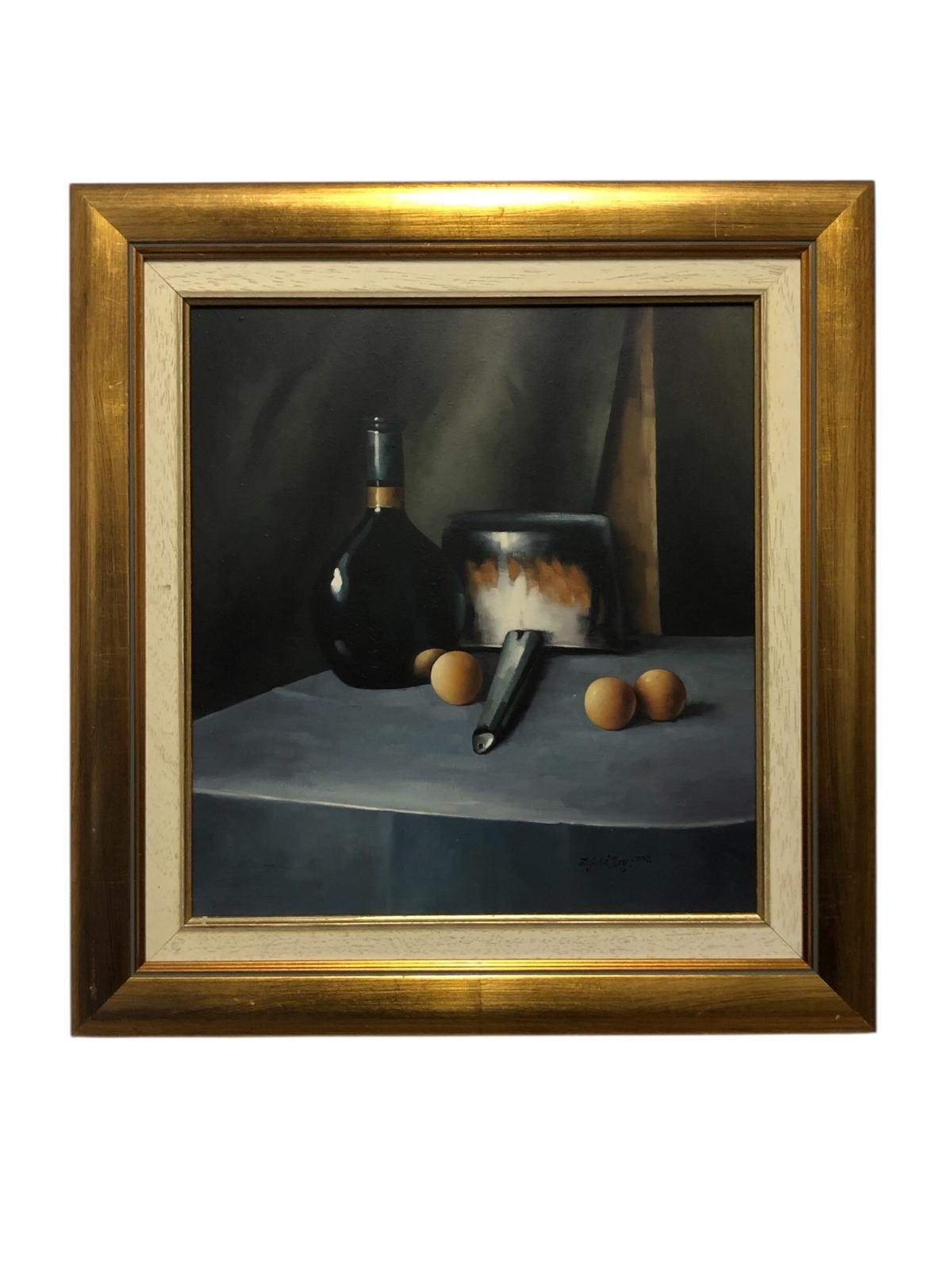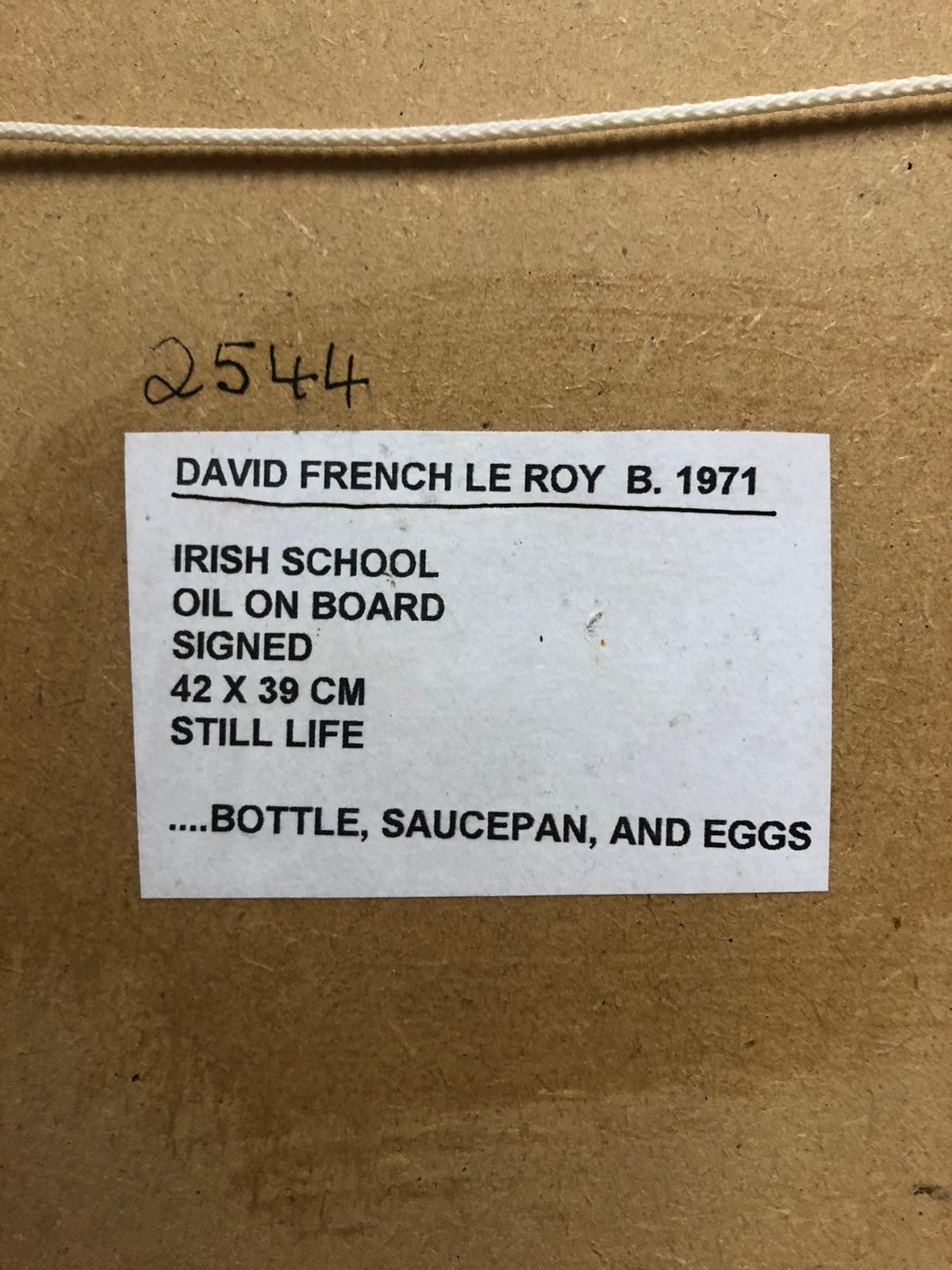 DAVID FRENCH LE ROYStill Life Bottle Pot and EggsOil on Board42cm (h) x 38cm (w)