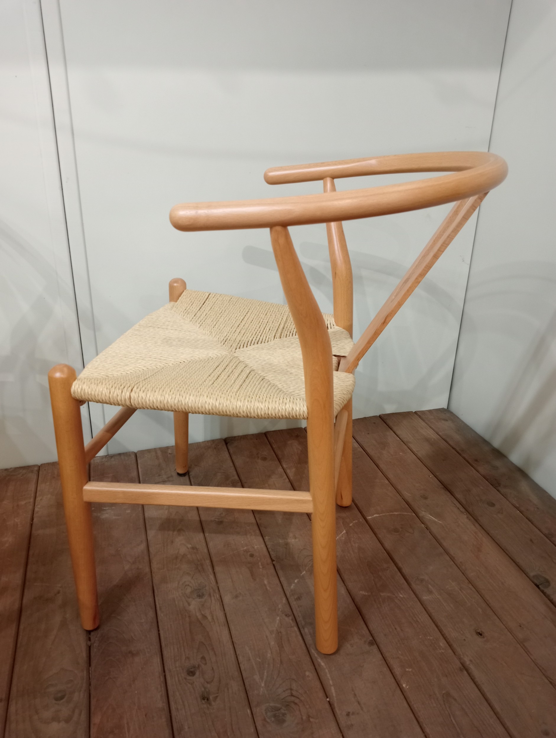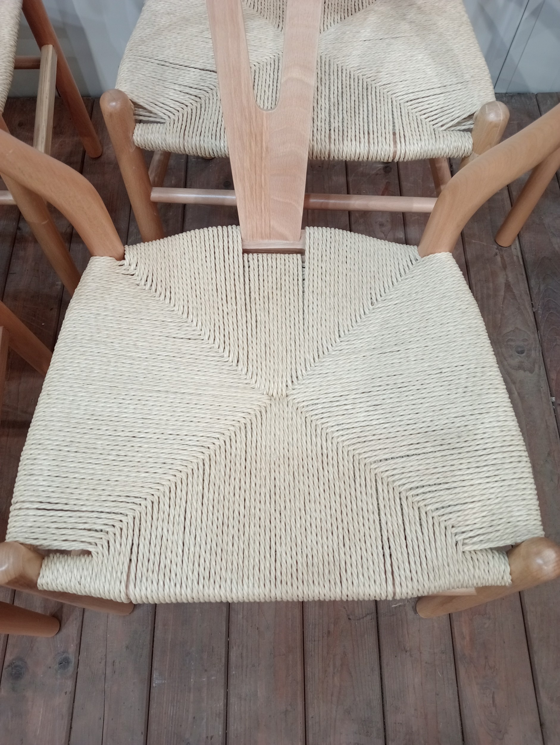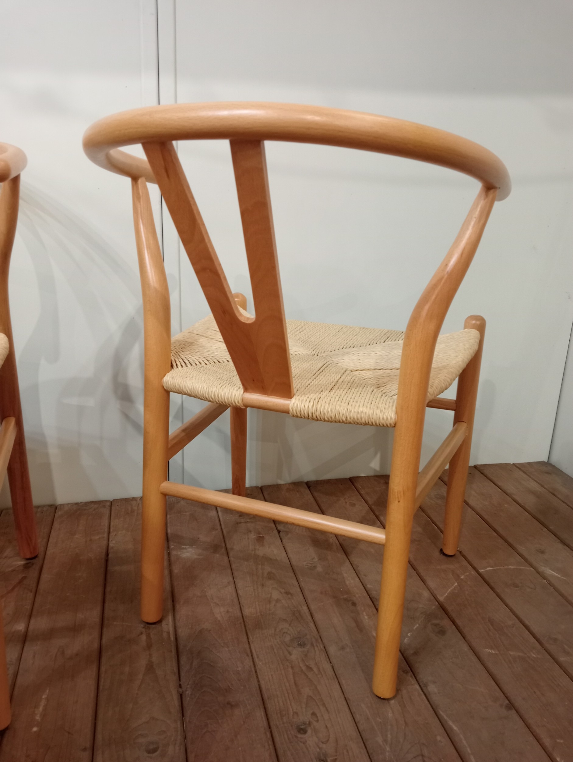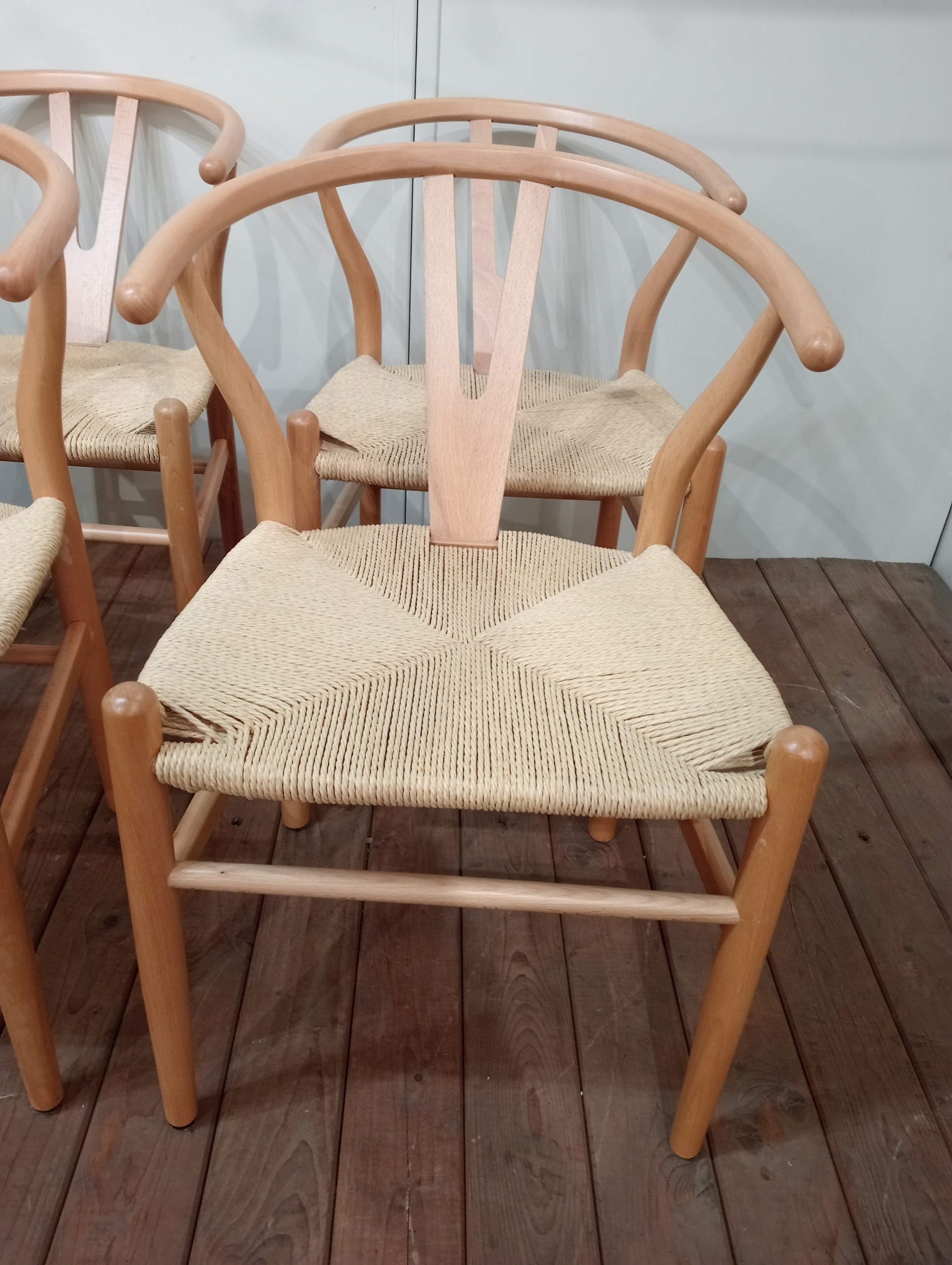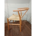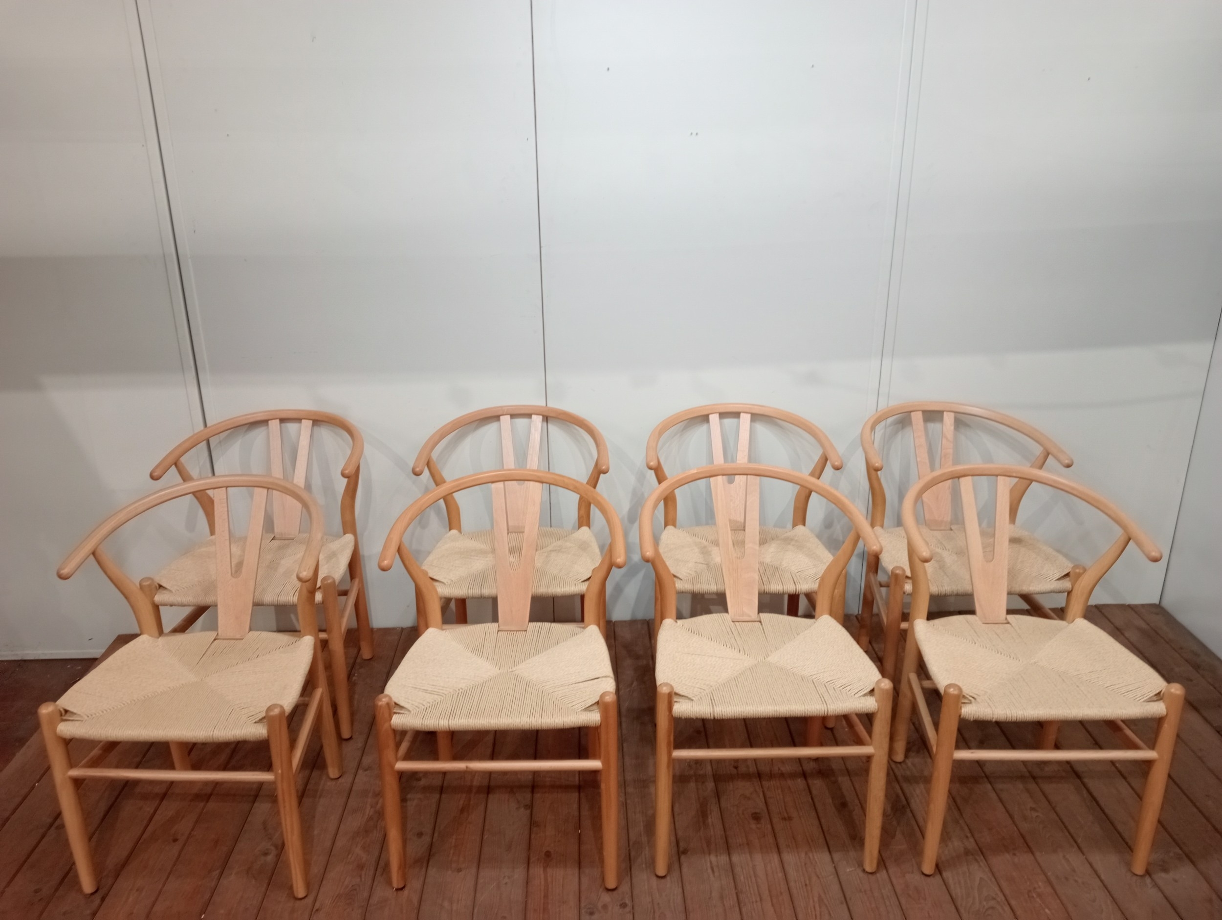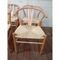 A SET OF EIGHT HANS J. WEGNER STYLE WISHBONE CHAIRS with woven ropework seats on cylindrical tapering legs