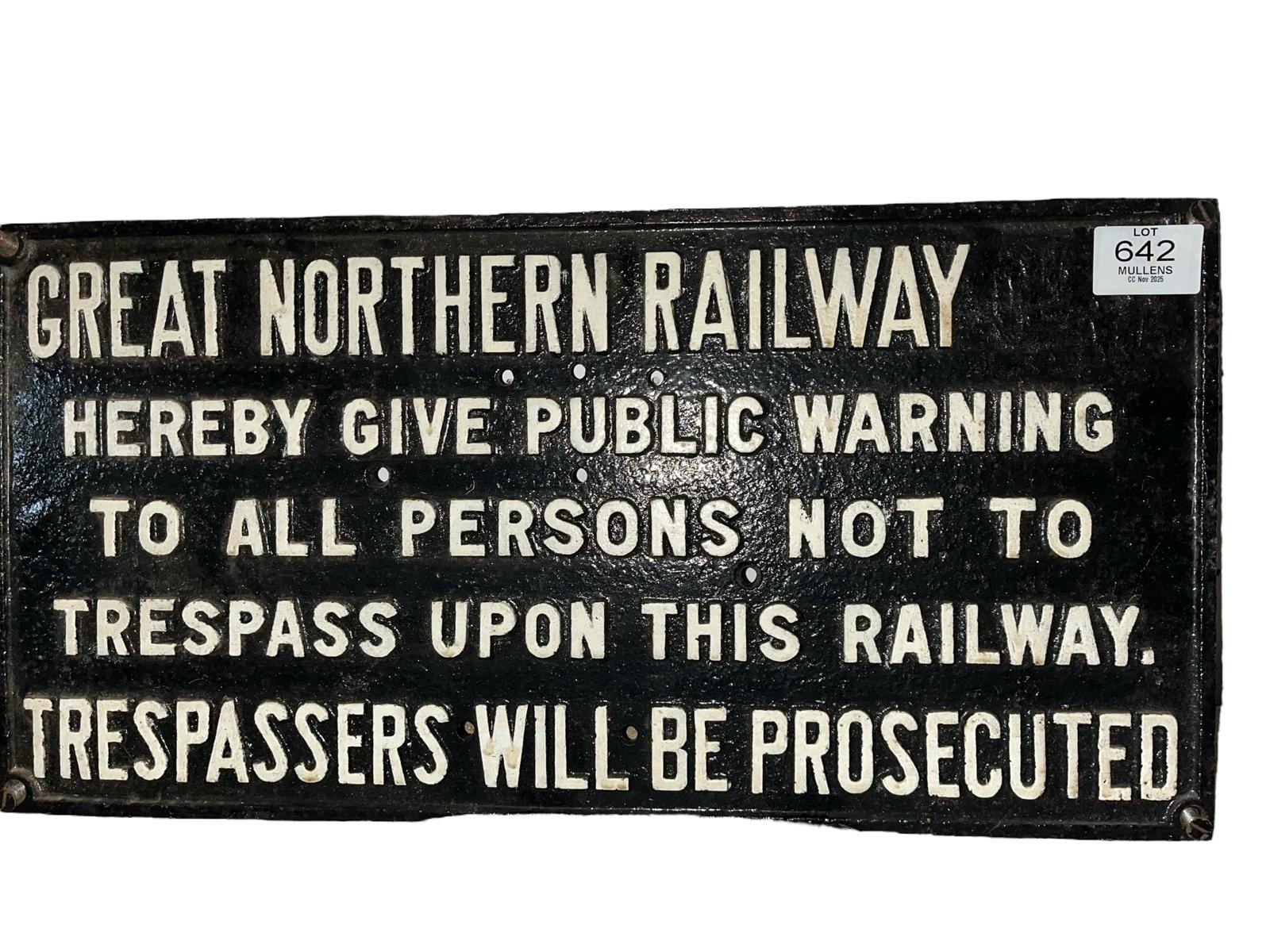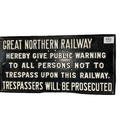 GREAT NORTHERN RAILWAY CAST IRON NOTICE TO TRESPASSERS 29cm (h) x 57cm (w)