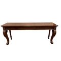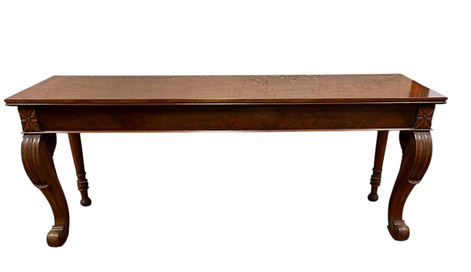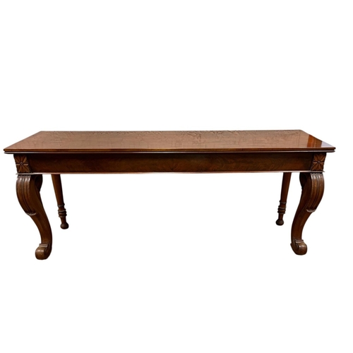 A WILLIAM IV MAHOGANY CONSOLE TABLE of rectangular outline the shaped top above a panelled frieze raised on front reeded scroll supports with foliate carving 90cm (h) x 222cm (w) x 63cm (d)