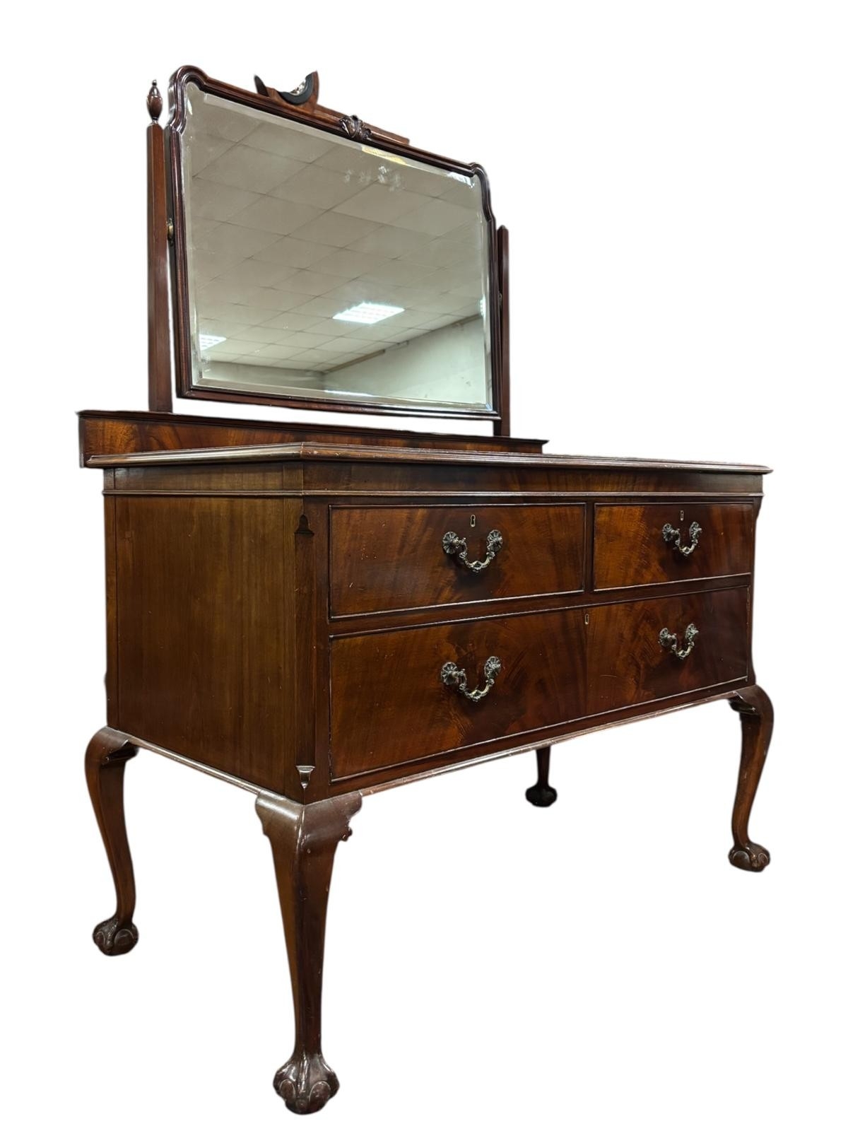 A VINTAGE MAHOGANY DRESSING CHEST the superstructure with bevelled glass swivel mirror above two short and one long drawer with brass drop handles on cabriole legs with claw and ball feet 146cm (h) x 113cm (w) x 58cm (d)