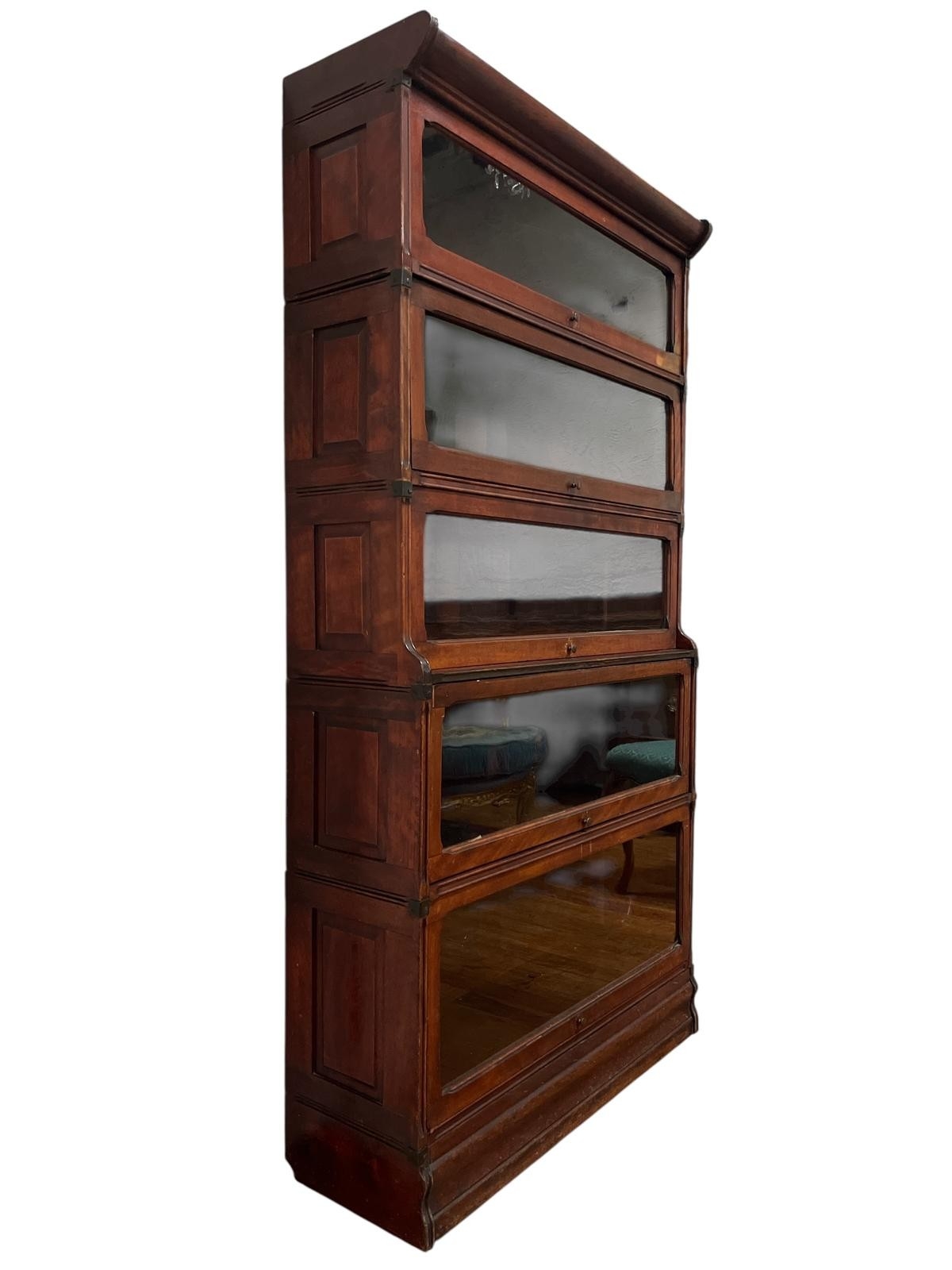 A VINTAGE STAINED WOOD FIVE TIER GLOBE-WERNICKE STYLE FIVE TIER SECTIONAL BOOKCASE with glazed doors on platform base 174cm (h) x 92cm (w) x 29cm (d)