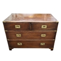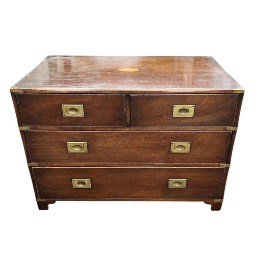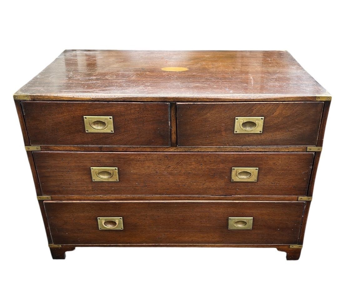A VINTAGE MAHOGANY AND BRASS BOUND MILITARY CHEST the rectangular top above two short and two long drawers with brass sunken handles on bracket feet with carrying handles 70cm (h) x 104cm (w) x 61cm (d)