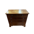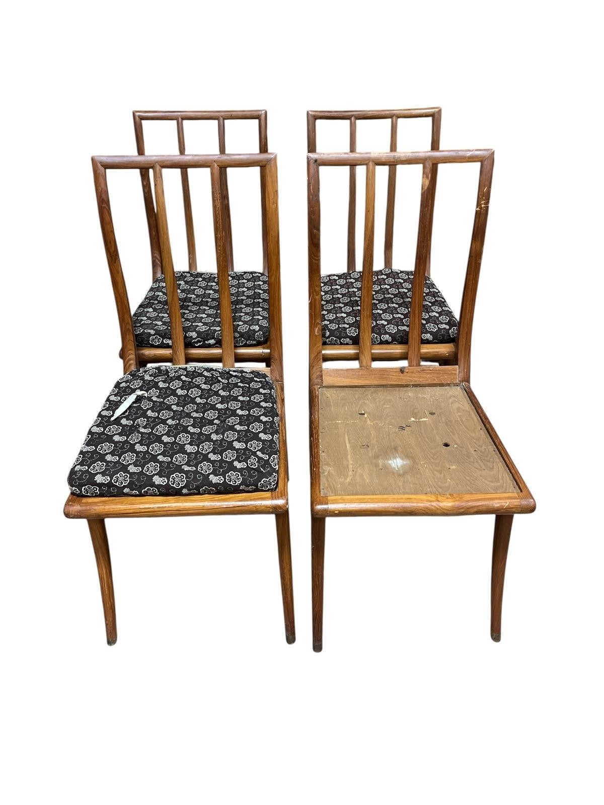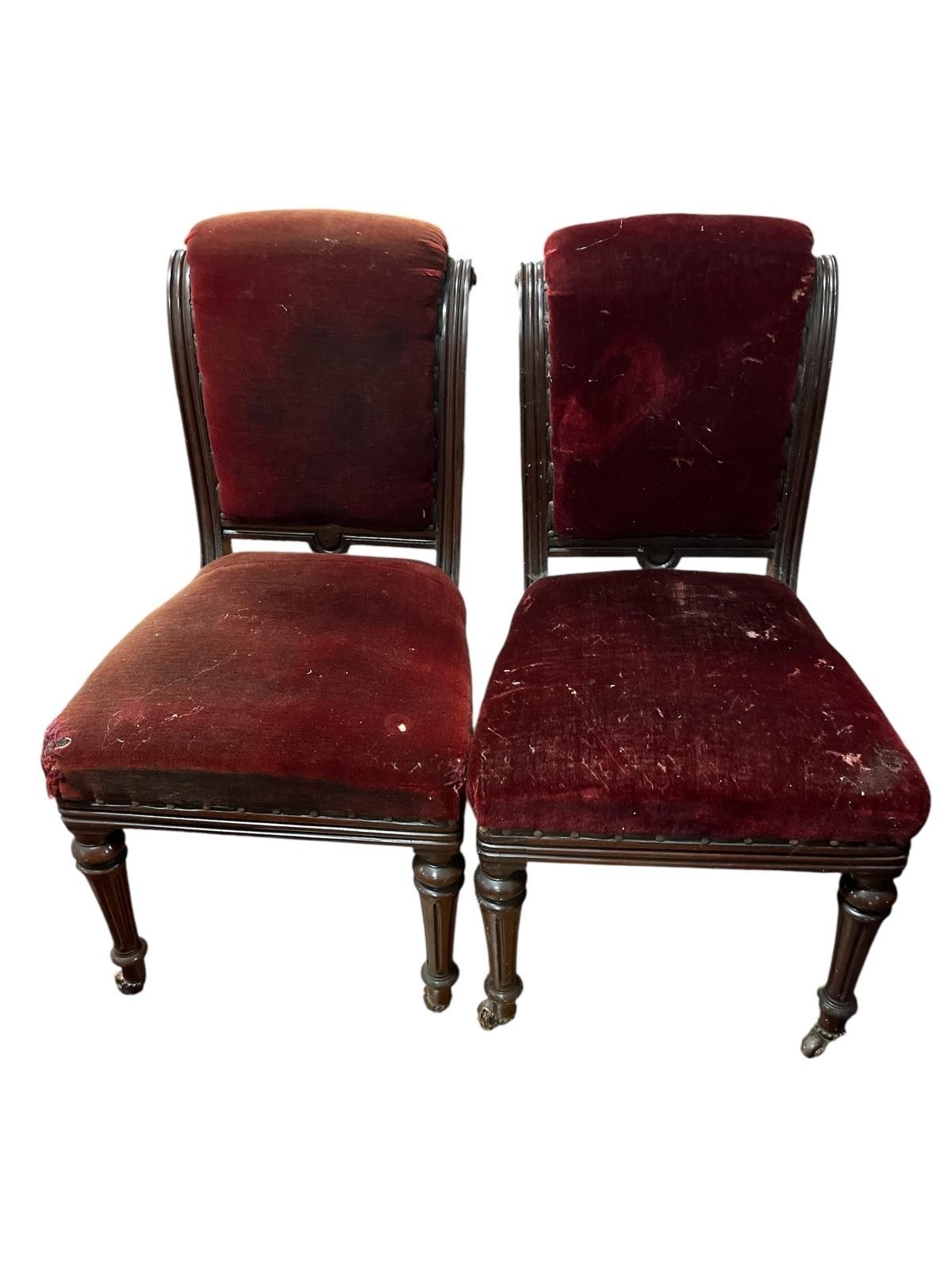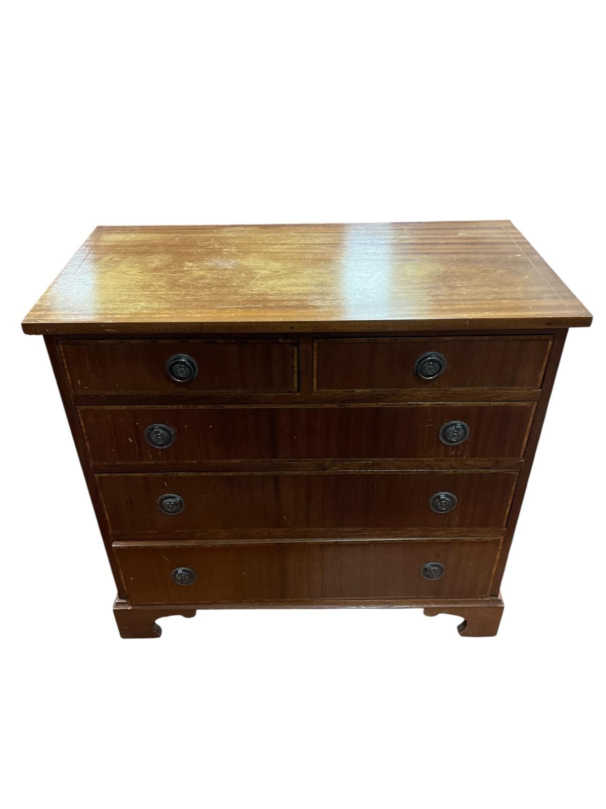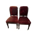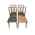 A MAHOGANY AND SATINWOOD INLAID CHEST OF DRAWERS of rectangular the shaped top above two short and three long graduated drawers on bracket feet 80cm (h) x 84cm (w) x 43cm (d), A PAIR OF 19TH CENTURY MAHOGANY AND UPHOLSTERED SIDE CHAIRS each with a scroll over back and seat on fluted and turned legs with castors, A SET OF FOUR VINTAGE TEAK DINING ROOM CHAIRS each with a shaped splat and panel seats with loose cushions on sabre legs (lacking one cushion)