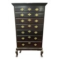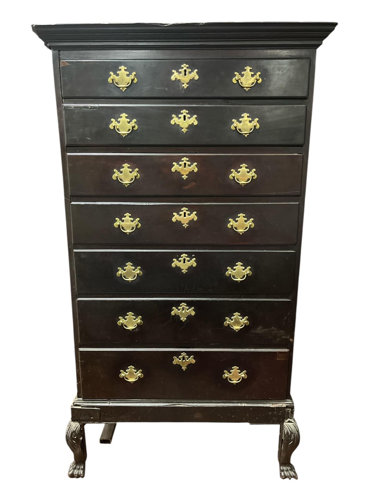 A GEORGIAN MAHOGANY TALLBOY the moulded cornice above seven long graduated drawers with brass drop handles on carved claw feet 162cm (h) x 92cm (w) x 52cm (d)
