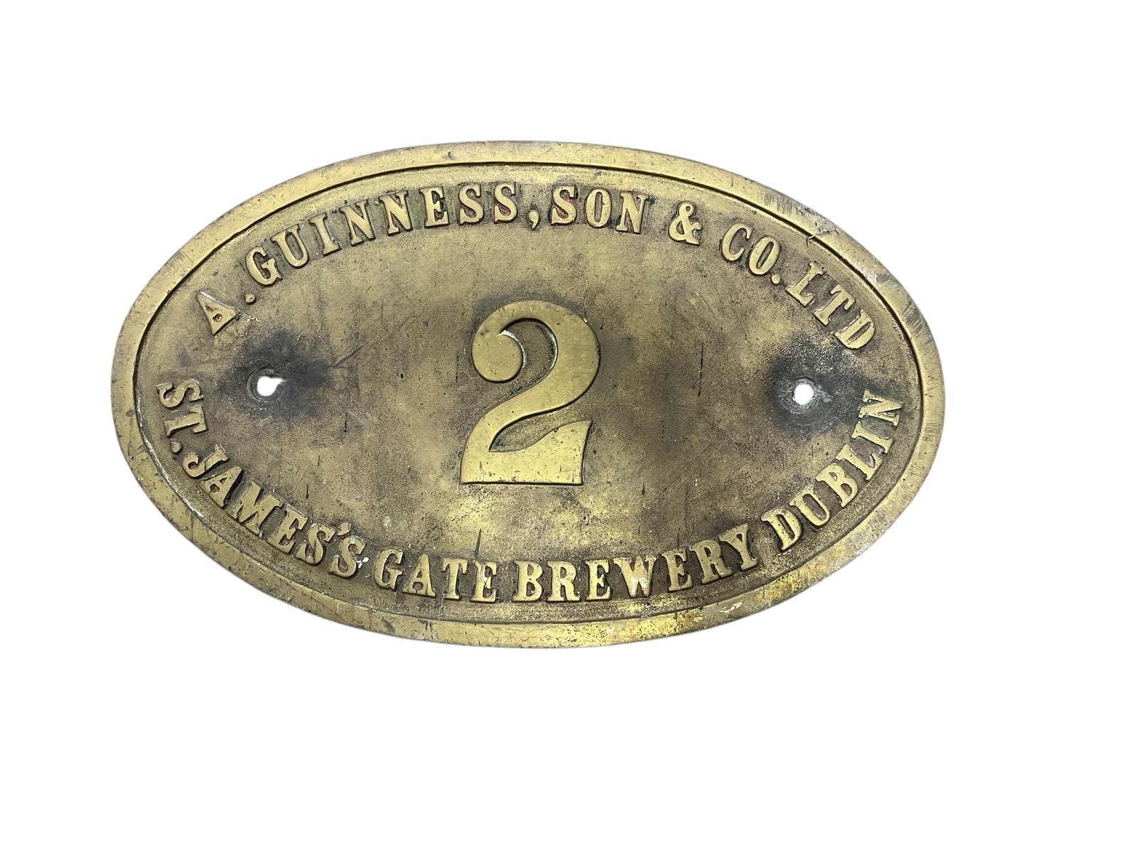 A BRASS ARTHUR GUINNESS & SON LOCOMOTIVE NUMBER PLATE bearing the number 2 31cm (h) x 28cm (w)