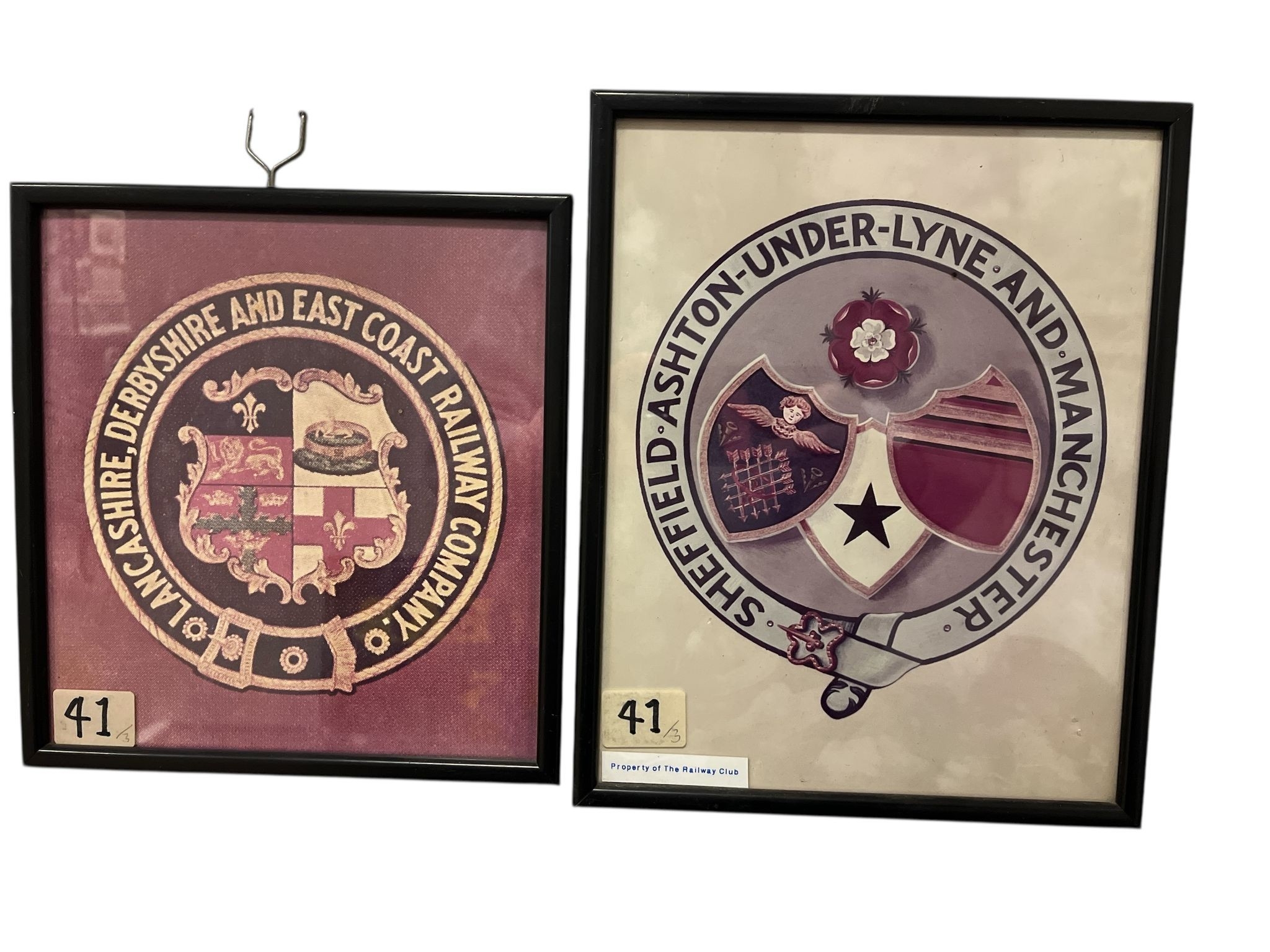 LANCASHIRE, DERBYSHIRE AND EAST COAST RAILWAY COMPANY COAT OF ARMS framed and glazed 23cm (h) x 21cm (w) together with SHEFFIELD, ASHTON-UNDER-LYNE AND MANCHESTER COAT OF ARMS framed and glazed 27cm (h) x 22cm (w)