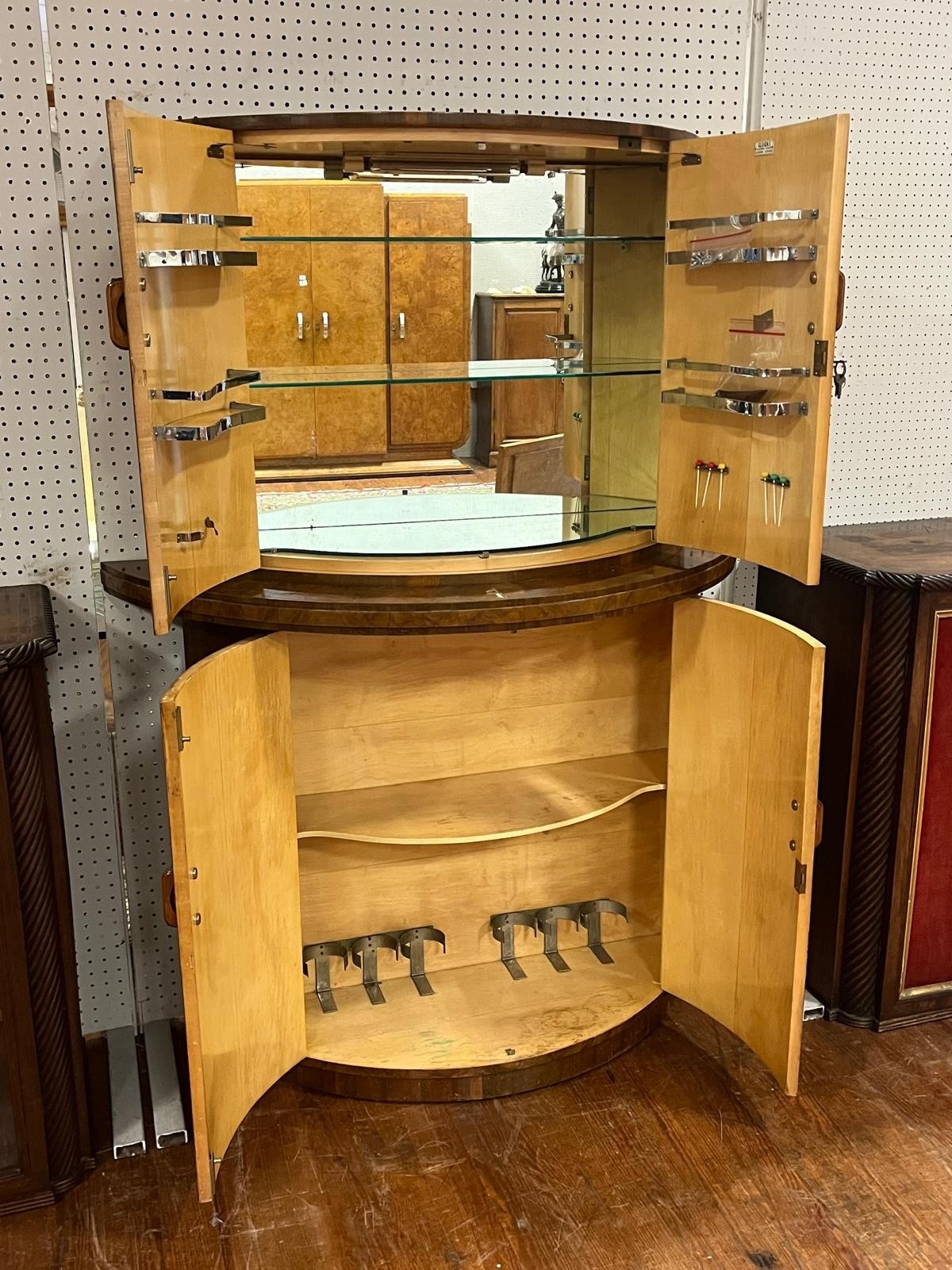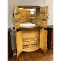 AN ART DECO COCKTAIL CABINET of demi lune outline the shaped top with cupboards containing a glazed and mirrored interior the base with cupboards containing shelves on platform support 165cm (h) x 120cm (w) x 48cm (d)