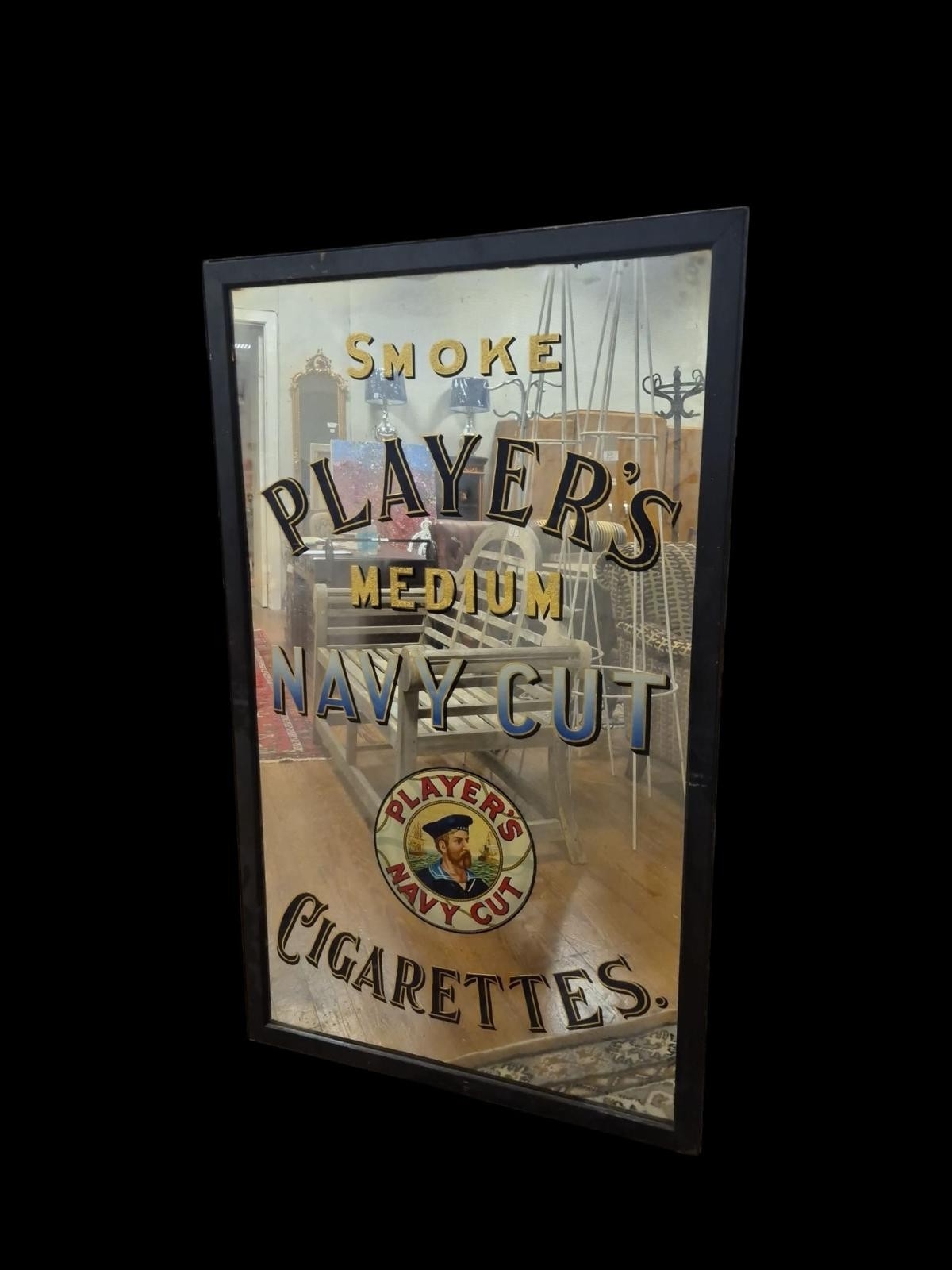A VINTAGE PLAYER'S ADVERTISEMENT MIRROR inscribed 'Smoke Player's Medium Navy Cut Cigarettes' In ebonised frame 153cm (h) x 92cm (w)