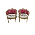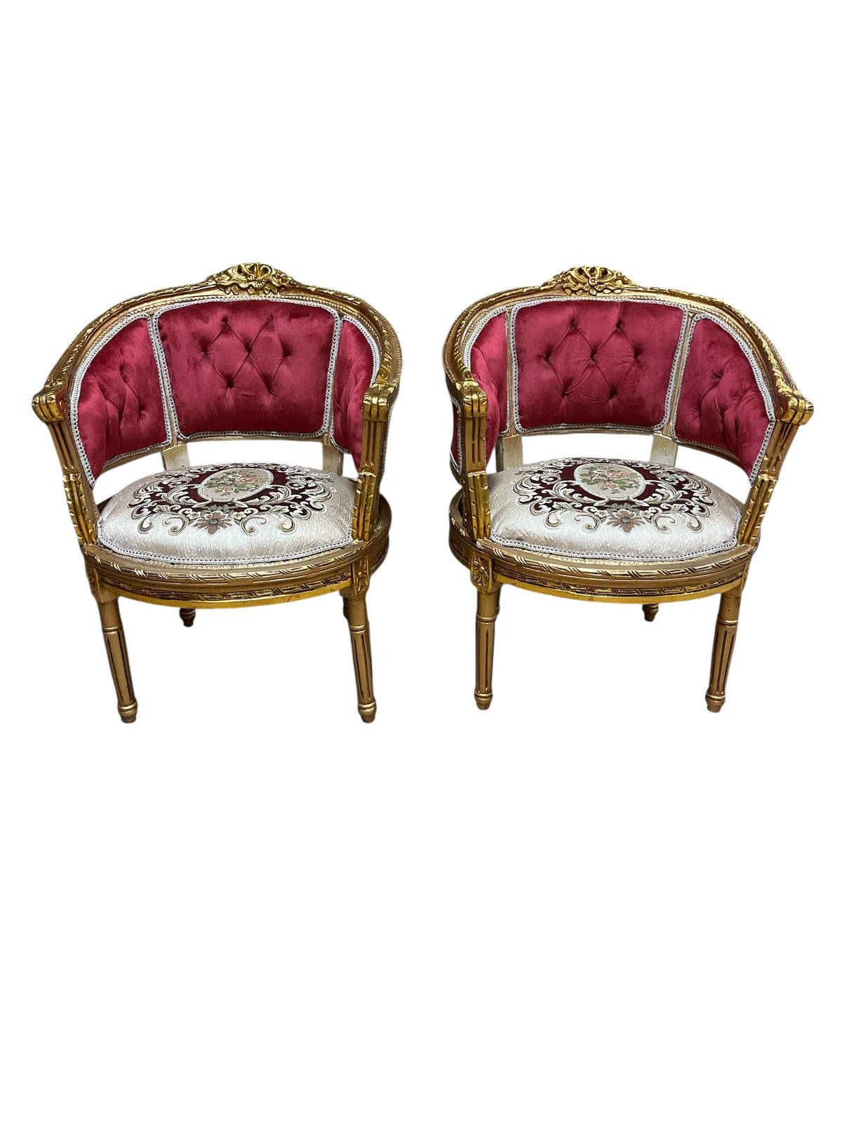 A PAIR OF CONTINENTAL GILTWOOD AND UPHOLSTERED TUB SHAPED CHAIRS each with pierced foliate cresting with buttoned upholstered back and needlework seats and scroll arms on fluted and turned legs