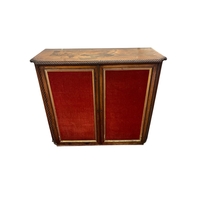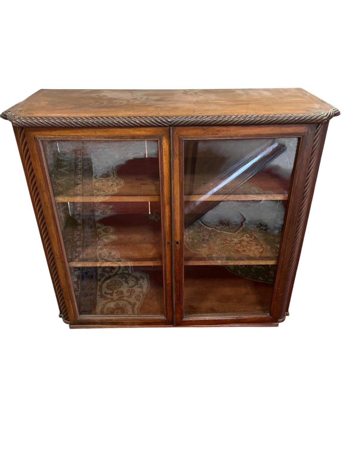 A REGENCY MAHOGANY SIDE CABINET of rectangular breakfront outline the shaped top with gadrooned rim above a pair of glazed doors between engaged spiral twist pilasters on moulded base 91cm (h) x 109cm (w) x 46cm (d)