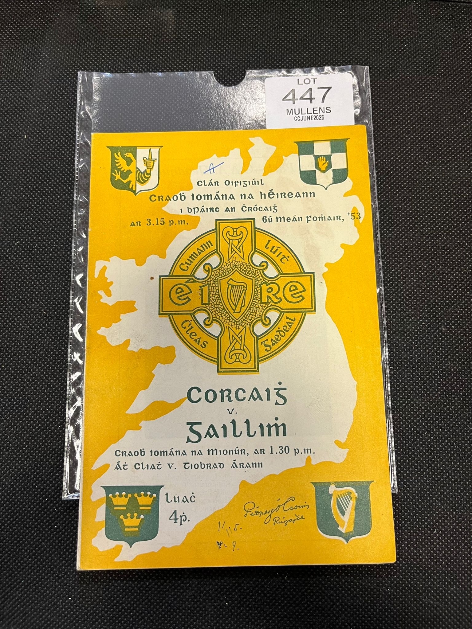 GAA: 1953 All-Ireland Hurling Senior Final Programme. Cork v Galway. Light soiling, some writing. Very Good.