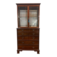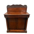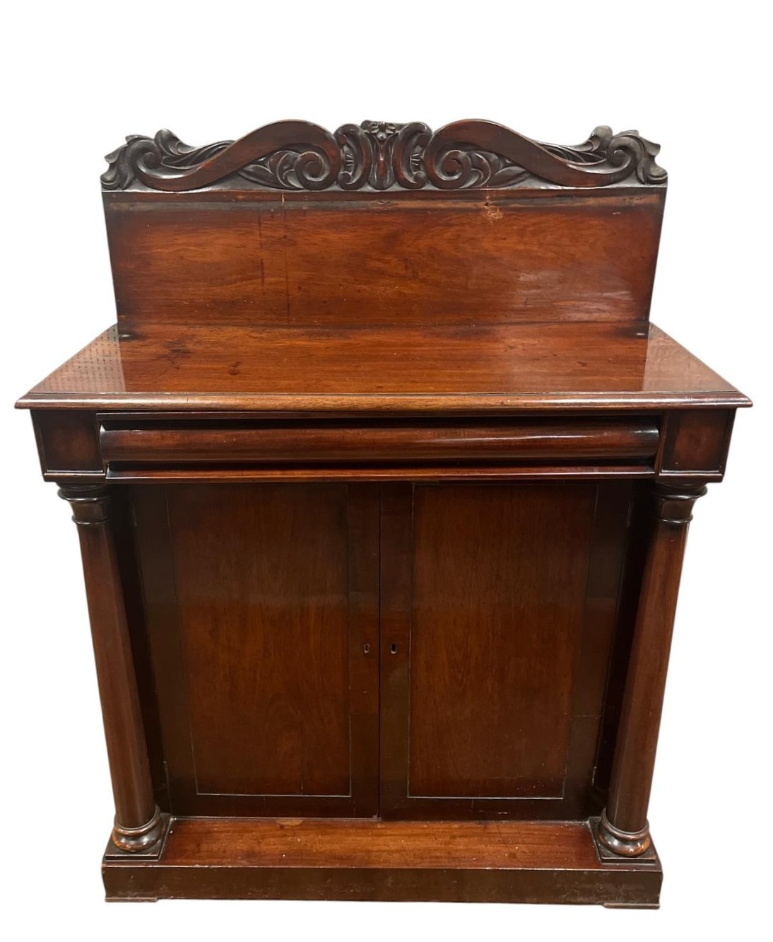 A 19TH CENTURY MAHOGANY SIDE CABINET the superstructure with carved and moulded back above a frieze drawer and cupboards between cylindrical columns on platform support (Back AF) 132cm (h) x 105cm (w) x 46cm (d)