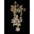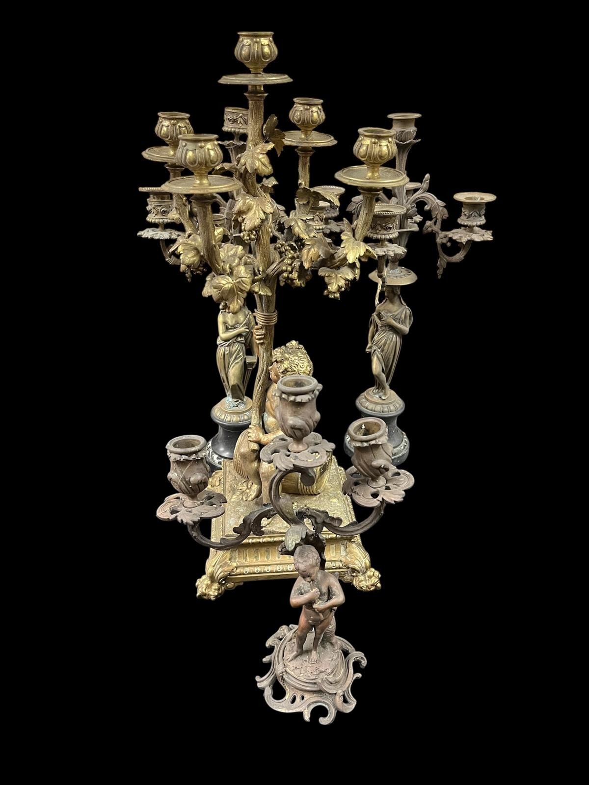A PAIR OF VINTAGE BRASS FIGURAL FIVE BRANCH CANDELABRA raised on a black marble platform 46cm (h), A VINTAGE BRASS FIVE BRANCH FIGURAL TABLE LAMP on claw feet 53cm (h)