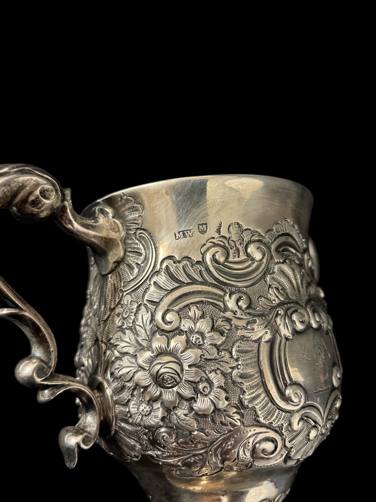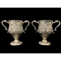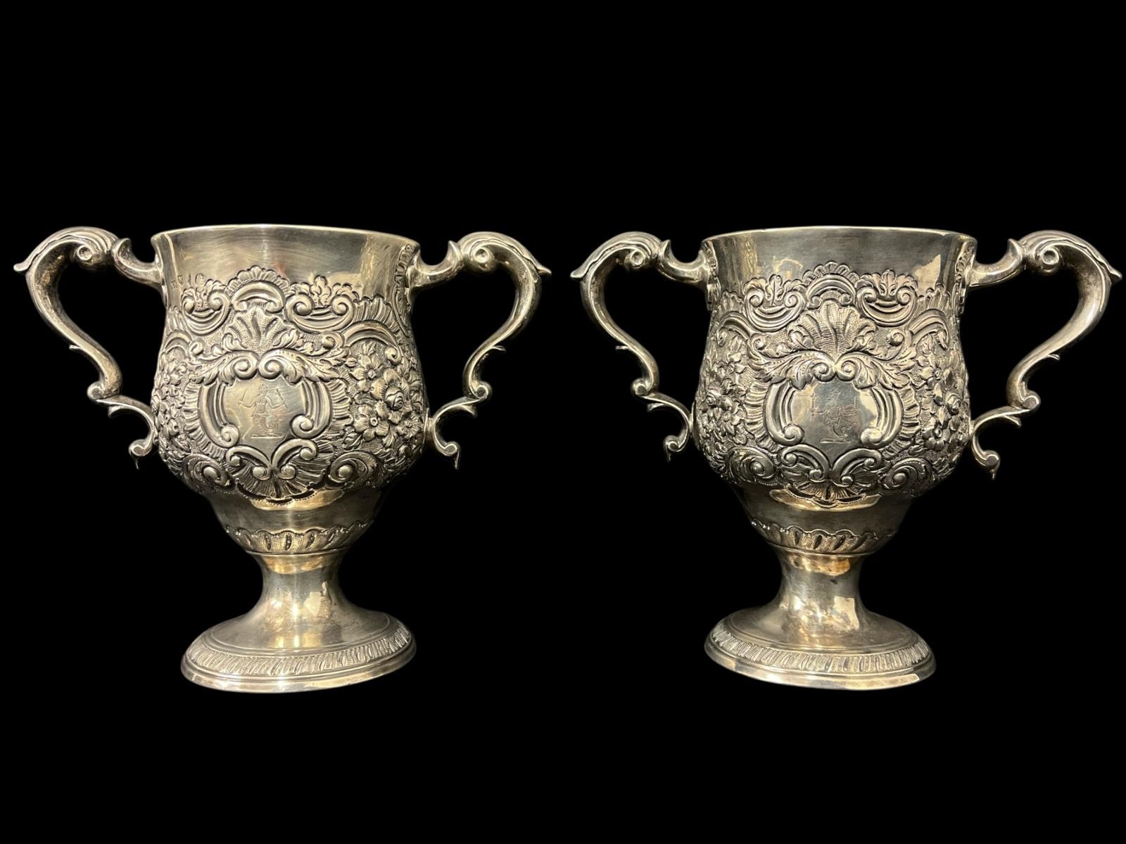 A PAIR OF GEORGIAN IRISH SILVER TWIN-HANDLED CUPS Dublin 1784, maker's mark of Matthew West, of baluster outline with chased ornamentation and applied acanthus wrapped handles on splayed circular feet 15cm (h) 824g (26.5 troy oz)
