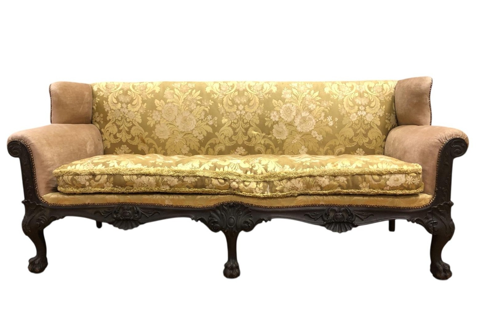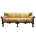 A CHIPPENDALE STYLE MAHOGANY AND UPHOLSTERED WING BACK SETTEE the rectangular back and seat with loose cushion and scroll over arms on carved lion claw supports with shell apron 195cm (w)