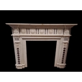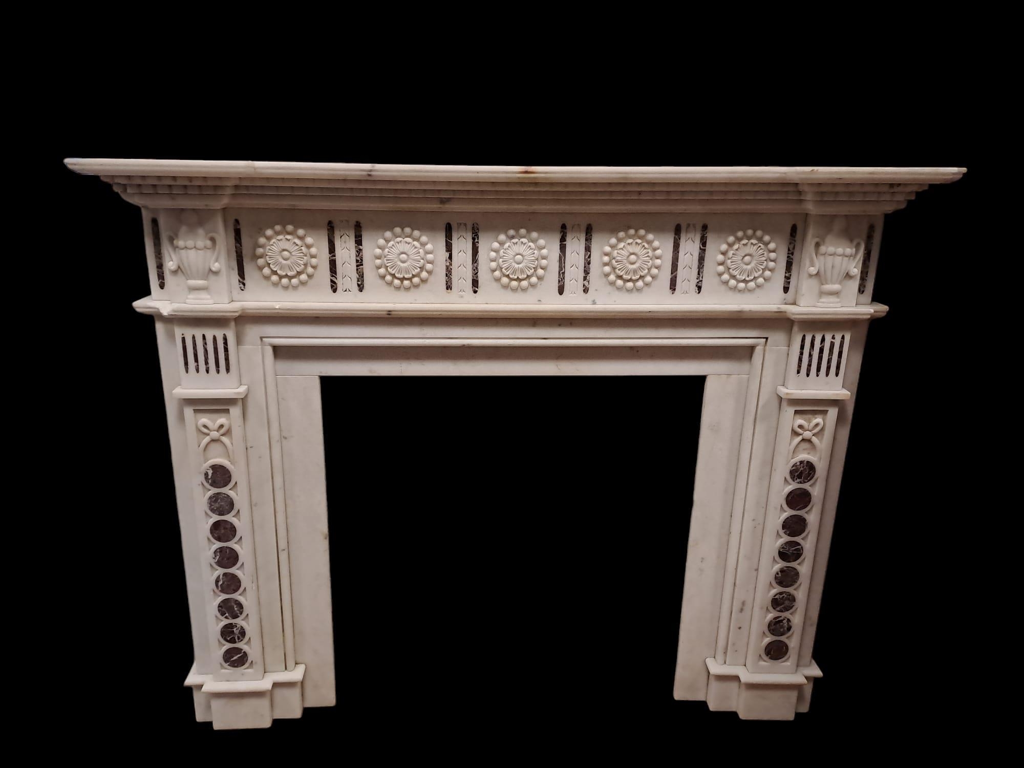 A WHITE MARBLE INLAID CHIMNEY PIECE of inverted breakfront outline the stepped shelf above a paterae decorated frieze with inlaid panels raised on panelled jabs with ribbon tied decoration on stepped block supports 140cm (h) x 178cm (w) x 28cm (d)