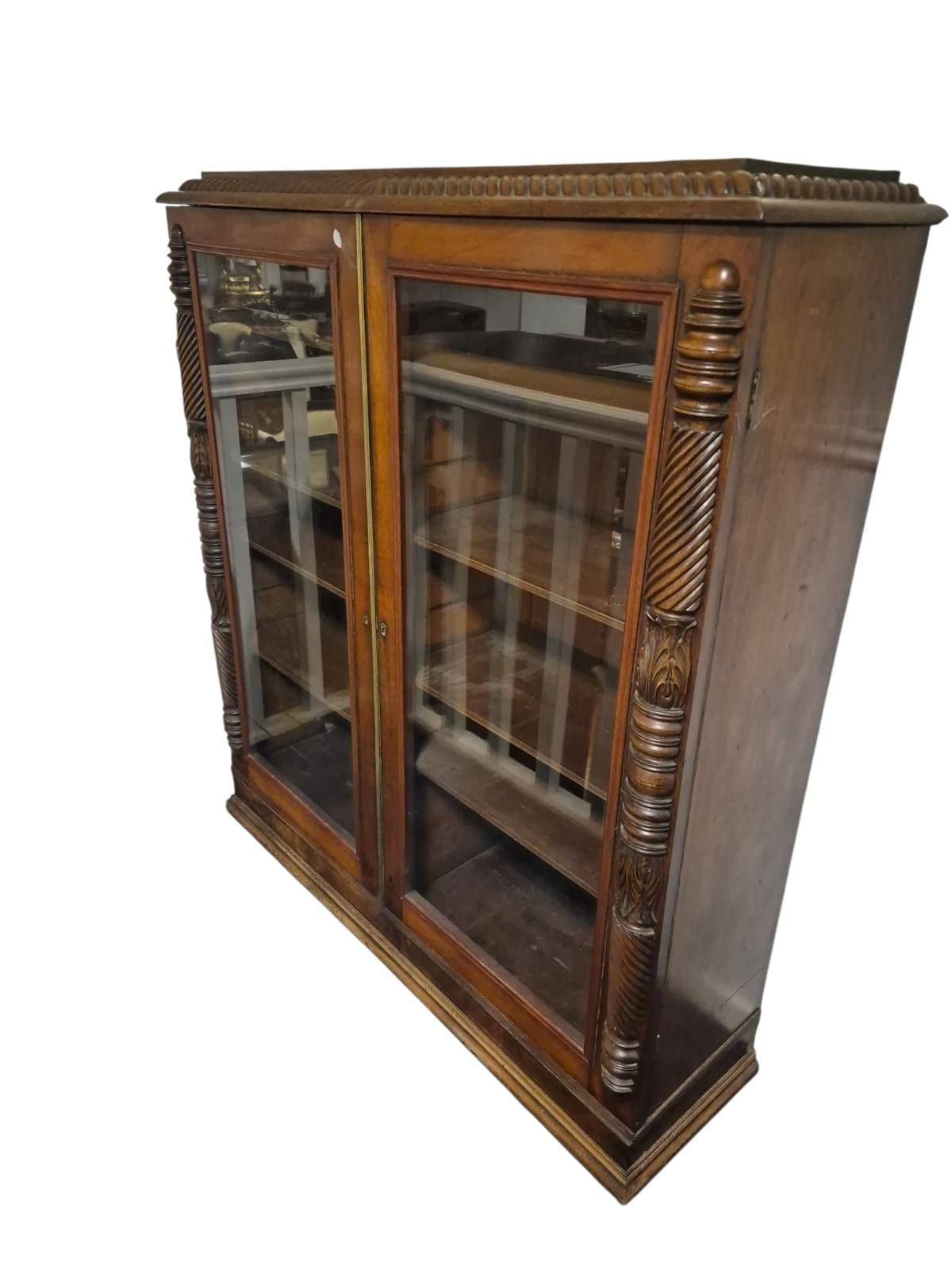 A 19TH CENTURY MAHOGANY BOOKCASE of rectangular outline the shaped top with gadrooned rim above a pair of glazed doors containing adjustable shelves between spiral twist and foliate carved pilasters on platform support 126cm (h) x 114cm (w) x 33cm (d)