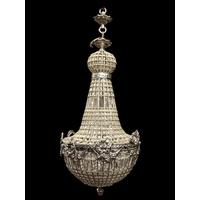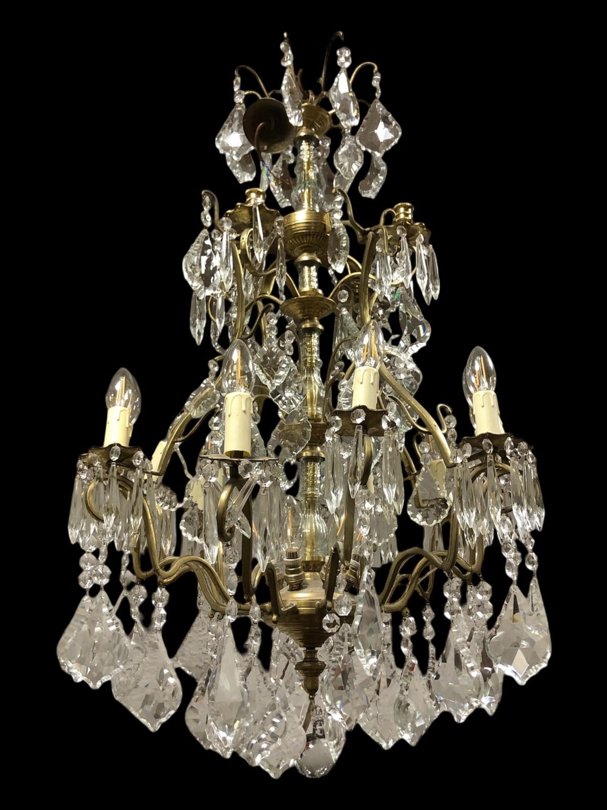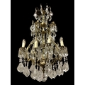 A FINE CONTINENTAL GILT BRASS AND CUT GLASS TWELVE BRANCH SIXTEEN LIGHT CHANDELIER the openwork frame hung with faceted chains and pendant drops 95cm drop