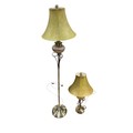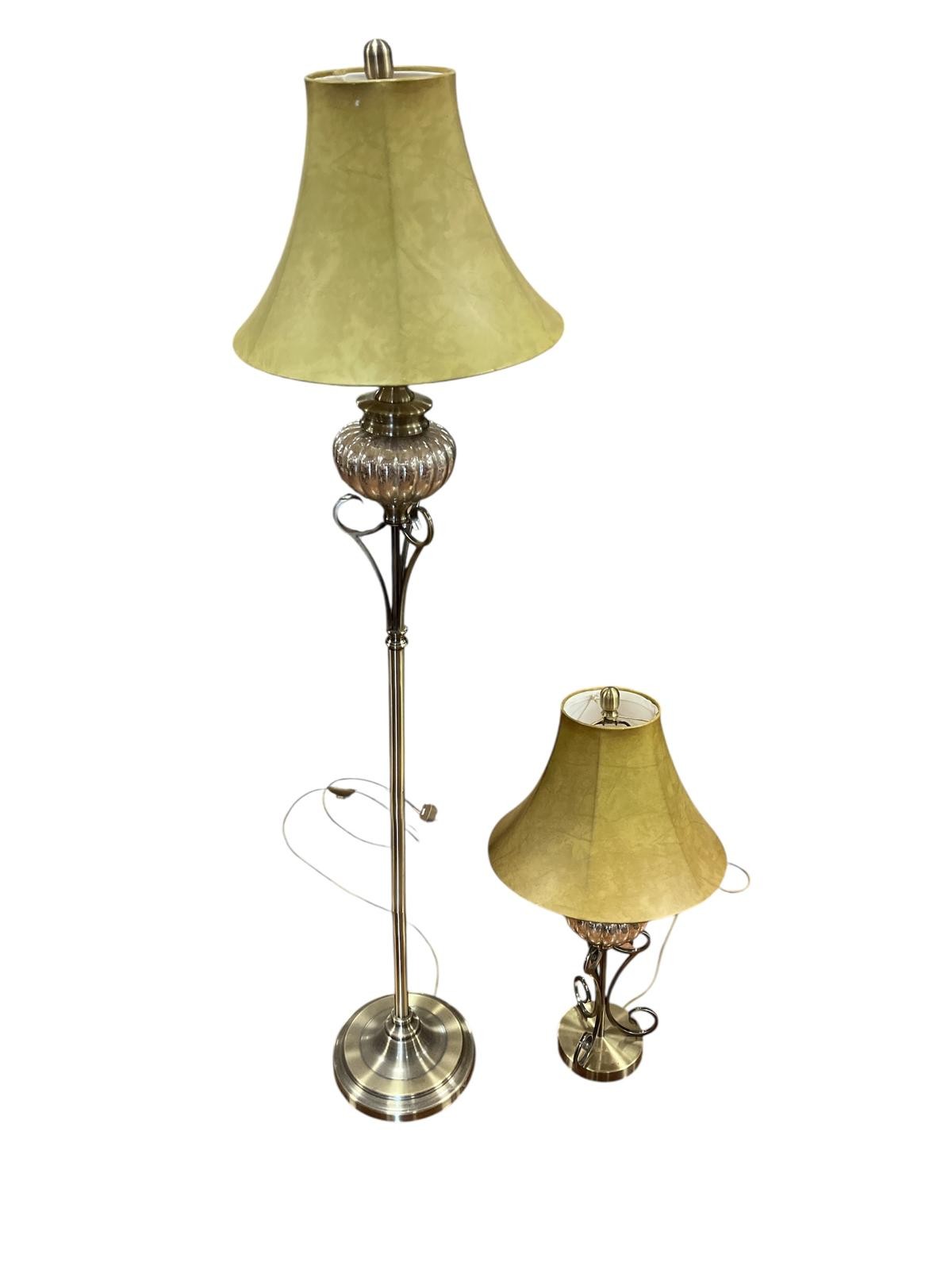 A CONTINENTAL SILVERED AND GLAZED STANDARD LAMP the cylindrical column headed with a lobed bowl above a circular spreading foot 160cm (h) together with a table lamp en suite 75cm (h) (2)