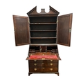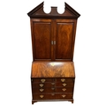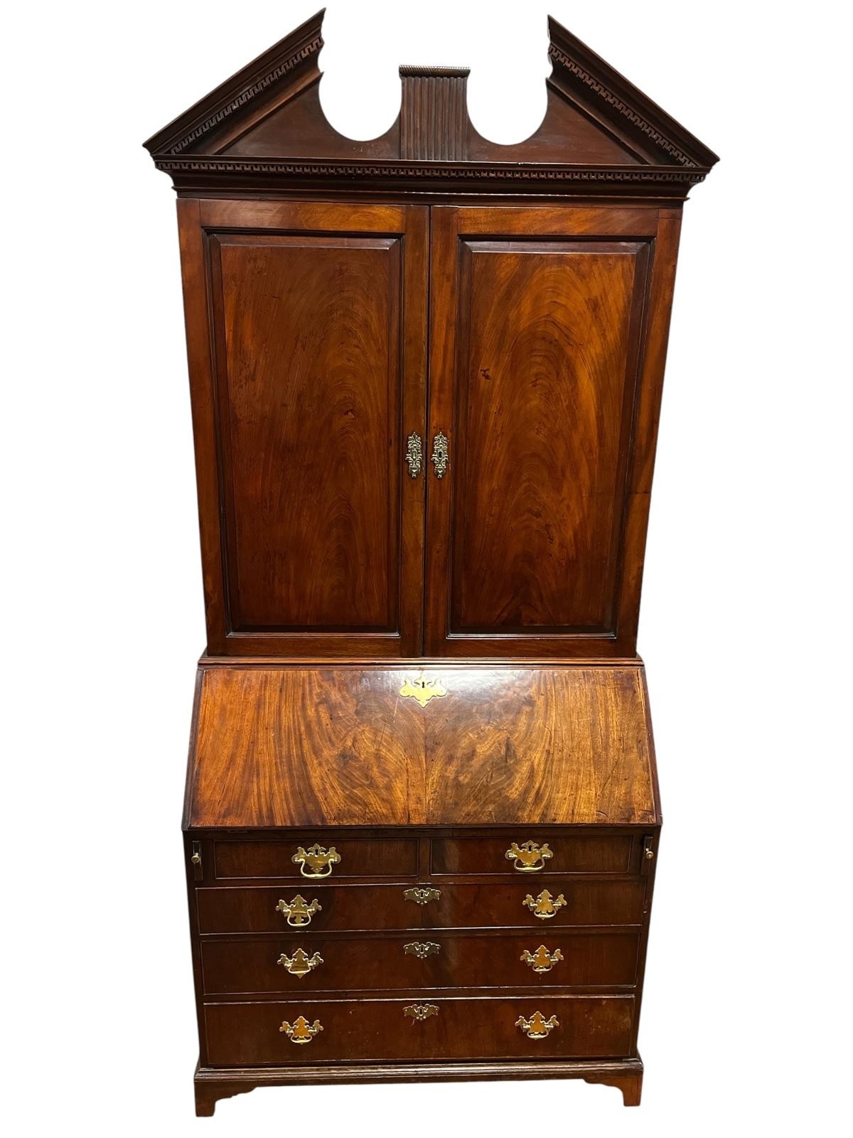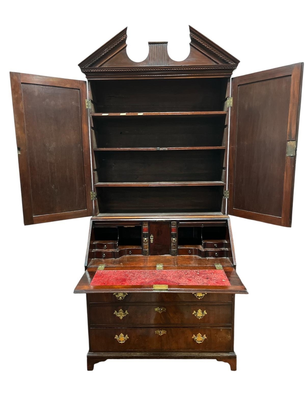 A FINE GEORGIAN MAHOGANY BUREAU BOOKCASE the architectural pediment above a pair of raised panel doors containing adjustable shelves the hinged writing slope containing pigeon holes, drawers and cupboard with tooled leather writing surface above two short and three long graduated drawers with brass drop handles on bracket feet 245cm (h) x 108cm (w) x 55cm (d)
