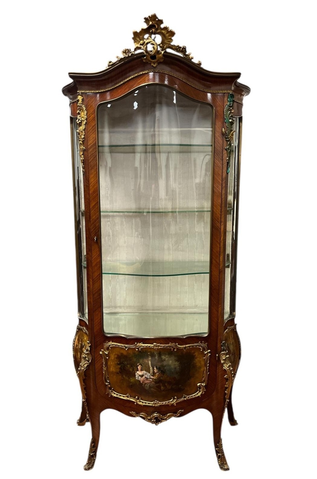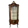 A LATE 19TH CENTURY CONTINENTAL KINGWOOD, GILT BRASS MOUNTED AND PAINTED CHINA DISPLAY CABINET of bombe outline the shaped cornice with gilt brass cresting above a bowed glazed door with painted panel containing glazed shelves on sabre legs with gilt brass sabots and mounts 194cm (h) x 94cm (w) x 46cm (d)